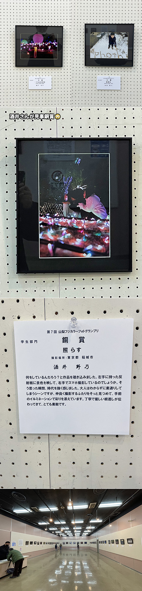 入賞者リストにはその人の住所が市町村まで表示されているので「お客さんから『学生部門』は何で県外の人ばかりなんだと何人も質問された」ということも受付の方から聞きました。確かに、出場資格は山梨県内の写真屋さんで「山梨フジカラー」でプリントした人のみですので、県外からわざわざ山梨まで来てプリントする人はまずいないですから珍しいですよね。質問がある度に本校の写真部の作品だと説明してくれたとのことです。ありがとうございます。